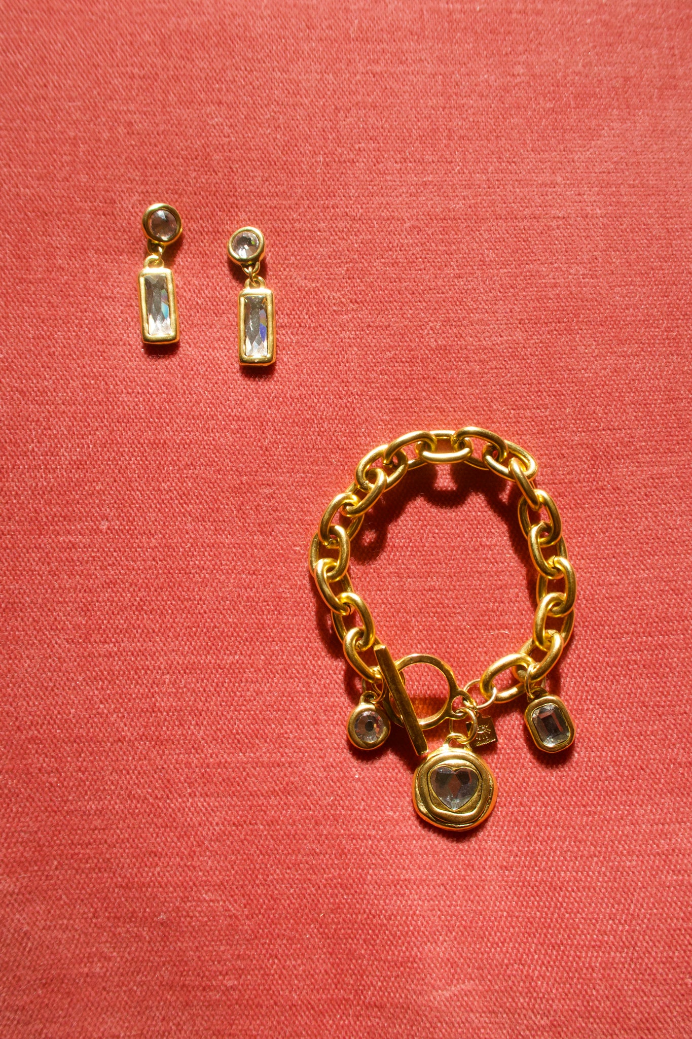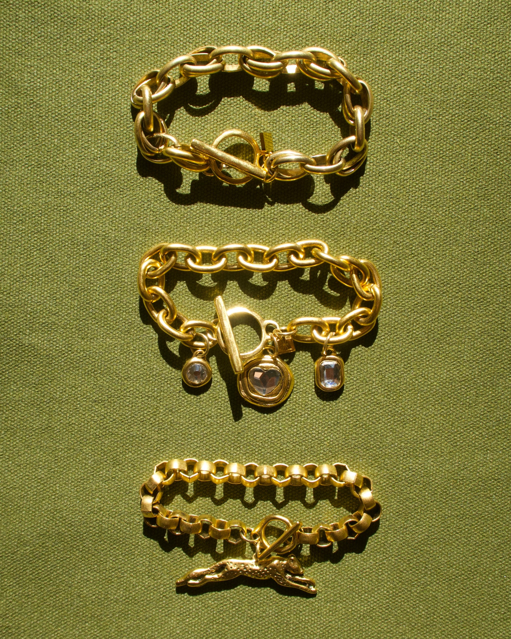 Daisy consists of 7.5" of 12k antiqued gold plated stainless steel chain and three 12k antiqued gold plated pewter crystal charms all tied together with a 12k antiqued gold plated pewter toggle clasp. Add some shimmer to any ensemble! :)
