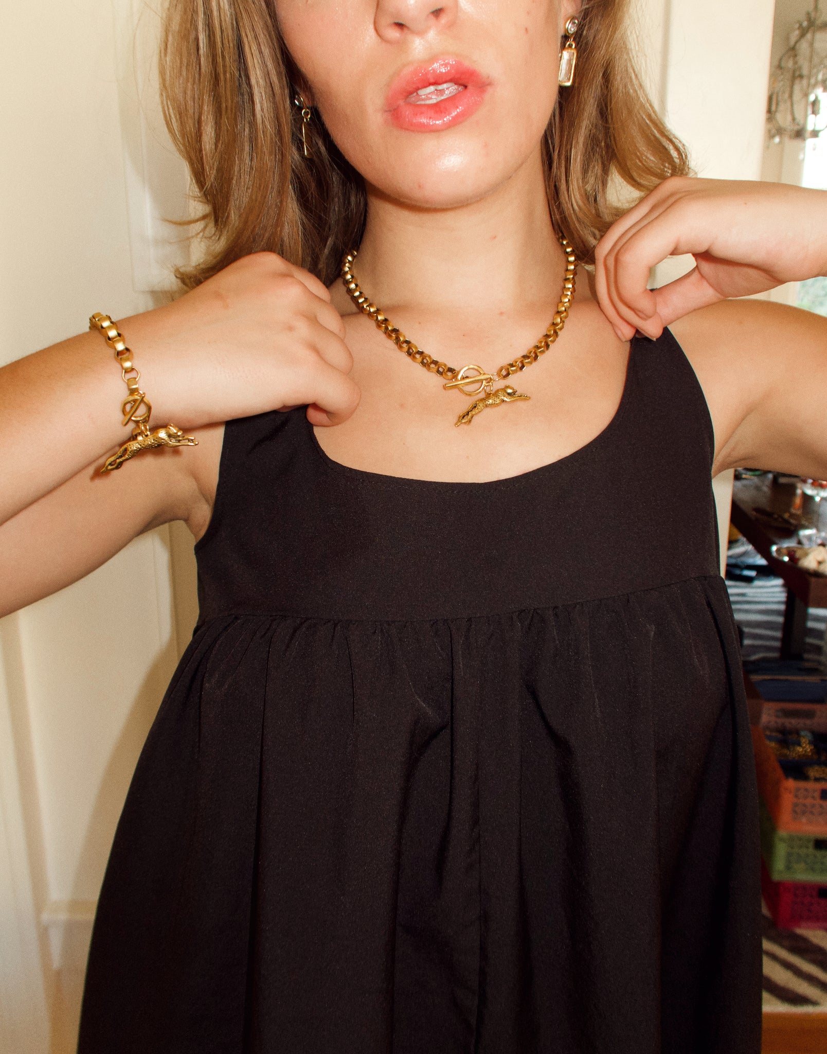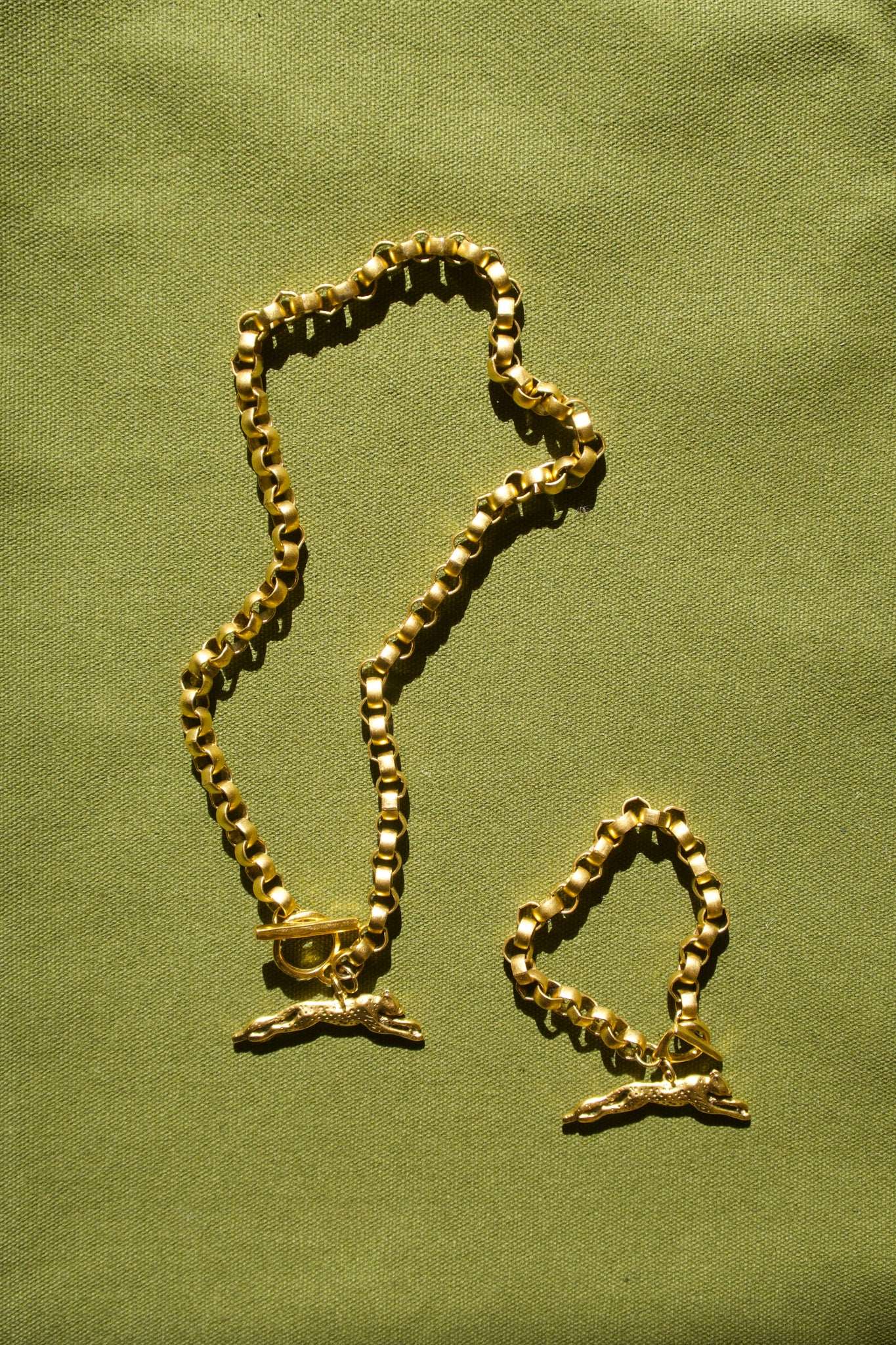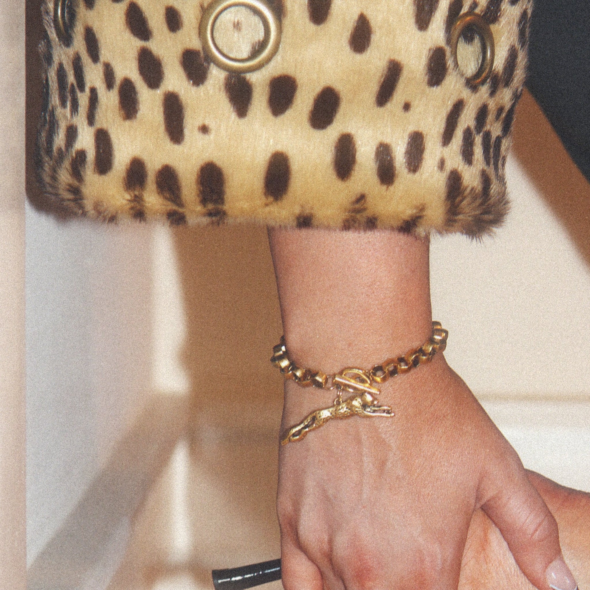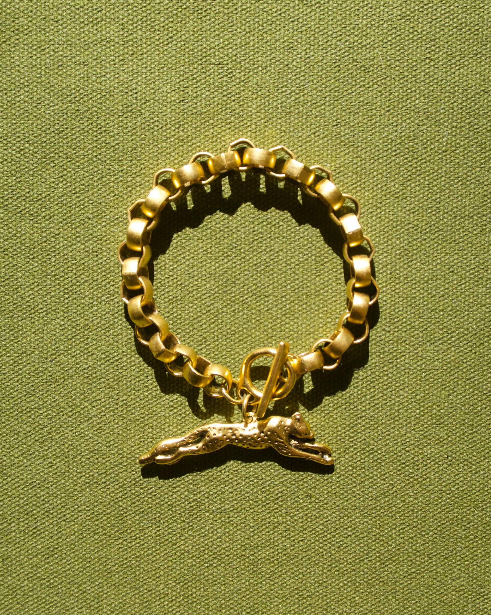 My dream pendant bracelet. This hand-carved 12k antiqued gold plated pewter leopard charm hangs from 7.5" of 12k antiqued gold plated brass rolo chain. The 12k antiqued gold plated pewter toggle clasp sits in the front and adds another decorative element!