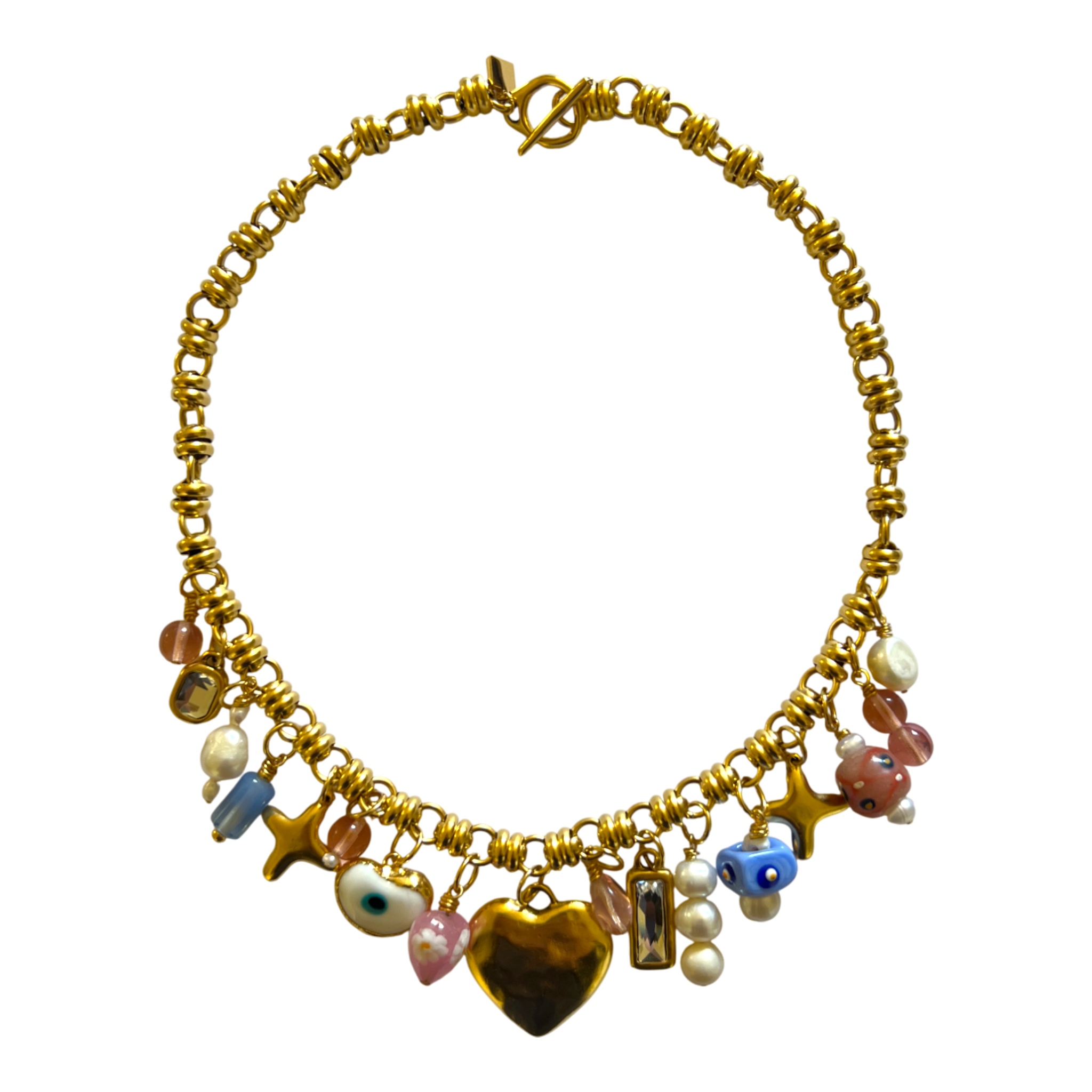 17" 12k antiqued gold plated brass multi ring chain adorned with a mini 12k antiqued gold plated pewter toggle clasp and a wide array of pink, blue, freshwater pearl and gold hand wire-wrapped charms from all over the world. Intricate blown glass charms from Italy, gems from southern America, freshwater pearls from China, and beads from Turkey. Charms may vary based on season and what’s in production :)