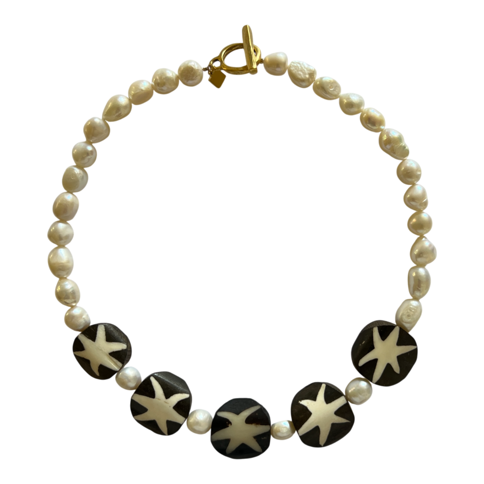 Nana features 17.5" of freshwater pearls, vintage African beads and a 12k antiqued gold plated toggle clasp <3