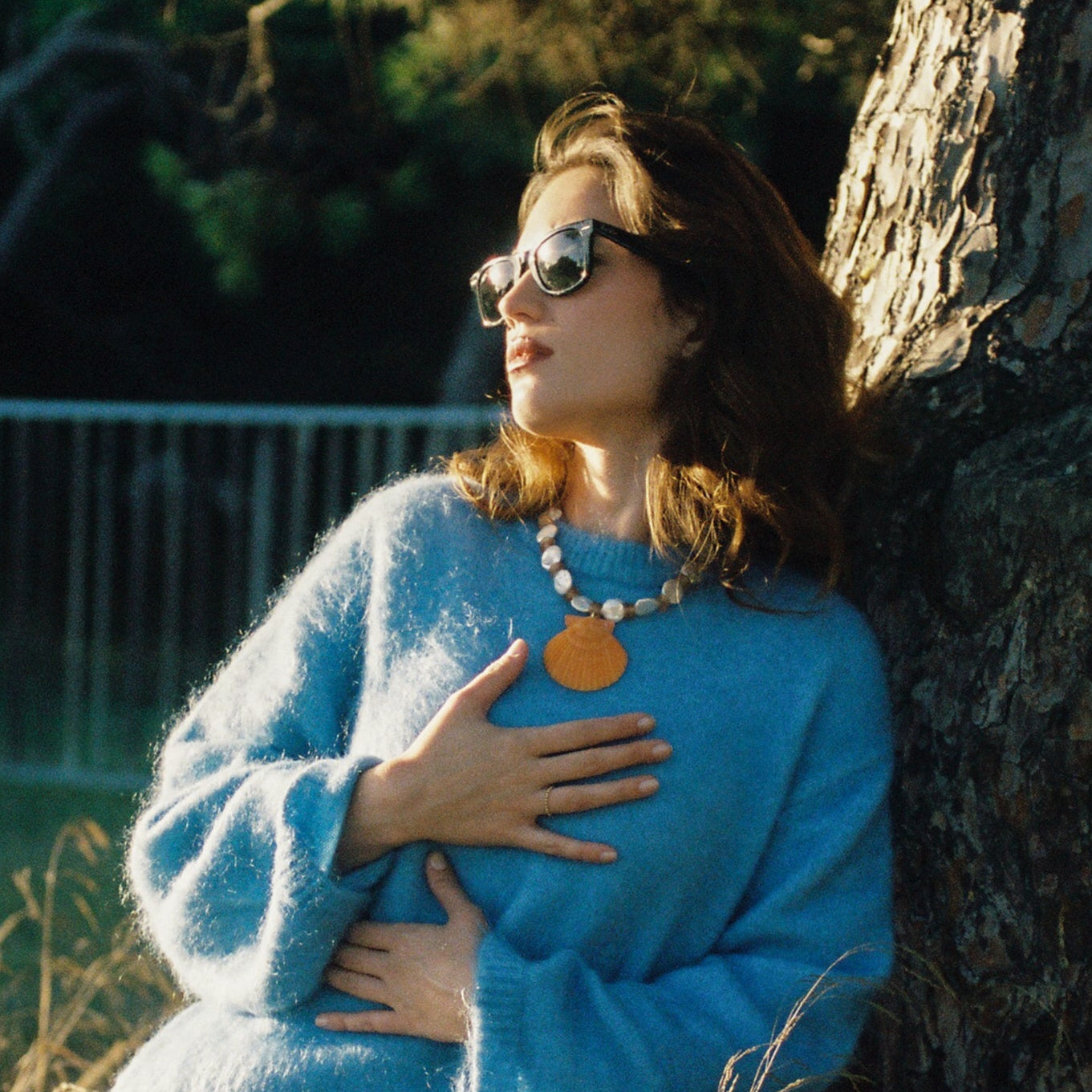 Sylvie is 18" of freshwater pearls and glass blown beads. She is paired with a beautiful orange seashell to carry you through the rest of your summer <3